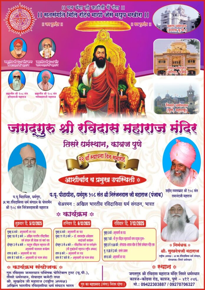 पुणे : जगद्गुरू श्री रविदास महाराज मंदिर तिसरे धर्मस्थान, कात्रज पुणे येथे २२ वॉं स्थापन दिन समारोह शुक्रवार ५ डिसेंबर ते ७ डिसेंबर २०२५ रोजी साजरा केला जाणार आहे. या सोहळ्यासाठी देशभरातून भक्तांसह मान्यवरांची उपस्थिती लाभणार आहे. तरी या सोहळ्यास उपस्थित राहण्याचे आवाहन राष्ट्रीय अध्यक्ष : अ.भा.रविदासिया धर्म संगठन, संस्थापक तिसरे धर्मस्थान निमंत्रक श्री सुखदेवजी महाराज यांनी केले आहे .