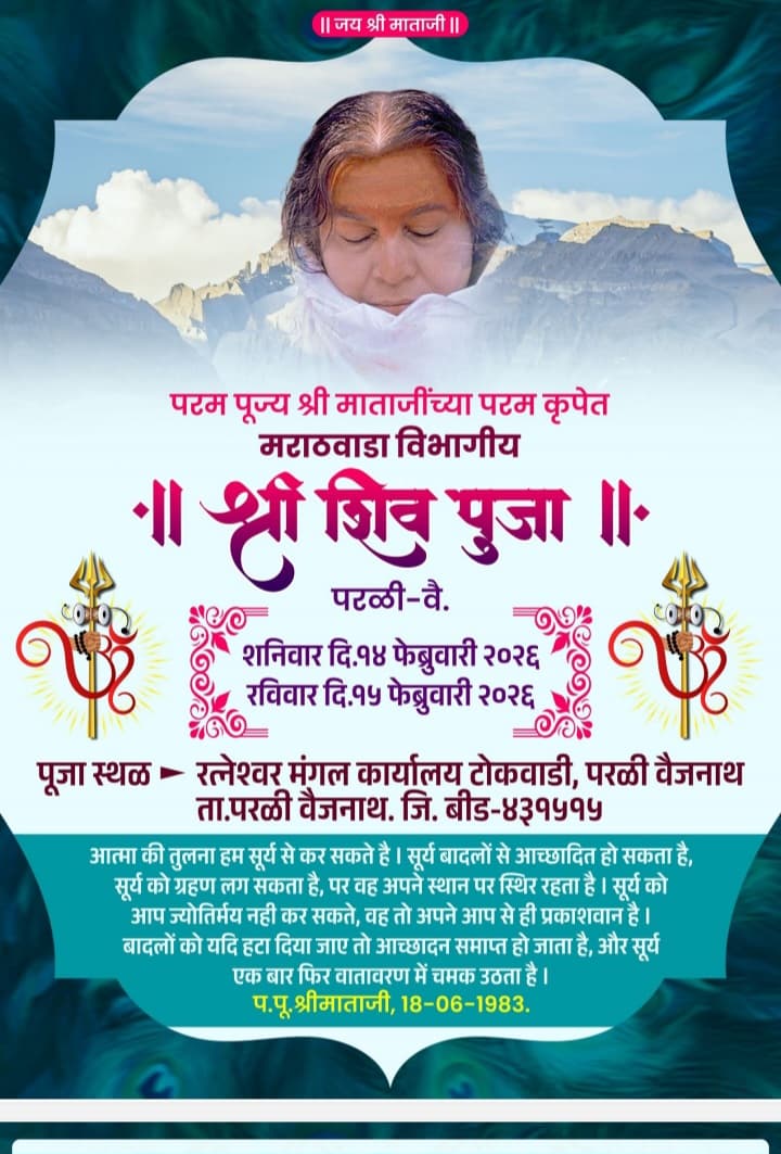 बारा ज्योतीर्लिंगापैकी एक मानल्या गेलेल्या श्री वैद्यनाथ देवस्थान परळी या पावनभुमीत परमपूज्य श्री माताजी निर्मलादेवींच्या परमकृपेत मराठवाडा श्री शिवपुजा व सेमिनार १४ , १५ फेब्रुवारी २०२५ रोजी आयोजित करण्यात आलेले आहे. सर्व सहस्त्र सहृदयी सहजयोगी साधकांना एकत्र आणणारी ही विभागीय ‘शिवपुजा व सेमिनार’ आहे. या कार्यक्रमासाठी मराठवाड्यातील आठही जिल्ह्यातील साधकांना आमंत्रित करण्यात आलेले आहे. तरी हे साधकांकाठी अभिमानाचे आणि अध्यात्मिक उन्नतीचे मोठे पर्व आणि पाऊल मानले जात आहे. तरी या शिवभुमीत परमचैतन्याचा लाभ घेण्यासाठी साधकांनी उपस्थित रहावे असे आवाहन मराठवाडा सहजयोग परिवाराच्या वतीने करण्यात आले आहे.