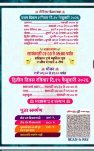 मराठवाडा विभागीय सामूहिक शिवपूजा प्रथमच टोकवाडीत दोन दिवसांचे अध्यात्मिक मार्गदर्शन, भजन संध्या, सामूहिक ध्यान परळीच्या पवित्र शिवभूमीत साधकांना मिळणार शिवतत्त्वाचा स्पंदनशील अनुभव सहजबालक व युवा शक्तींसाठी प्रेरक सेमिनार व सांस्कृतिक कार्यक्रम होणार आहेत. रत्नेश्वर मंगल कार्यालय, टोकवाडी, परळी वैजनाथ, जि. बीड शनिवार दिनांक १४ फेब्रुवारी रोजी सकाळी आगमन, नाश्ता व सेमिनार सत्र व त्यानंतर सांयकाळी ७ ते ९ भजन संध्या (पुणे प्रतिष्ठान म्युझीक ग्रुप राजीव बागडदे व टीम) होईल. भोजन रात्री ९ ते ११ या वेळेत राहील.