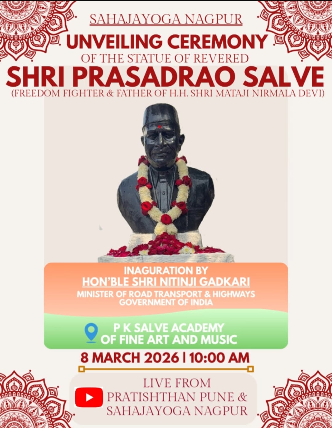 स्वर्गीय प्रसाद साळवे महात्मा गांधी यांचे निकटवर्ती होते. भारतीय संविधान सभेचे ते सदस्य होते, भारतीय संविधान निर्माणच्या ऐतिहासिक कार्यात त्यांनी विशेष सक्रिय भूमिका बजावली होती, या पुतळा अनावरण सोहळ्याचे आयोजन पी. के. साळवे ऍकॅडमीच्या वतीने करण्यात आले असून या कार्यक्रमाला नागरिकांनी मोठ्या संख्येने उपस्थित राहावे, असे आवाहन आयोजकांनी केले आहे.